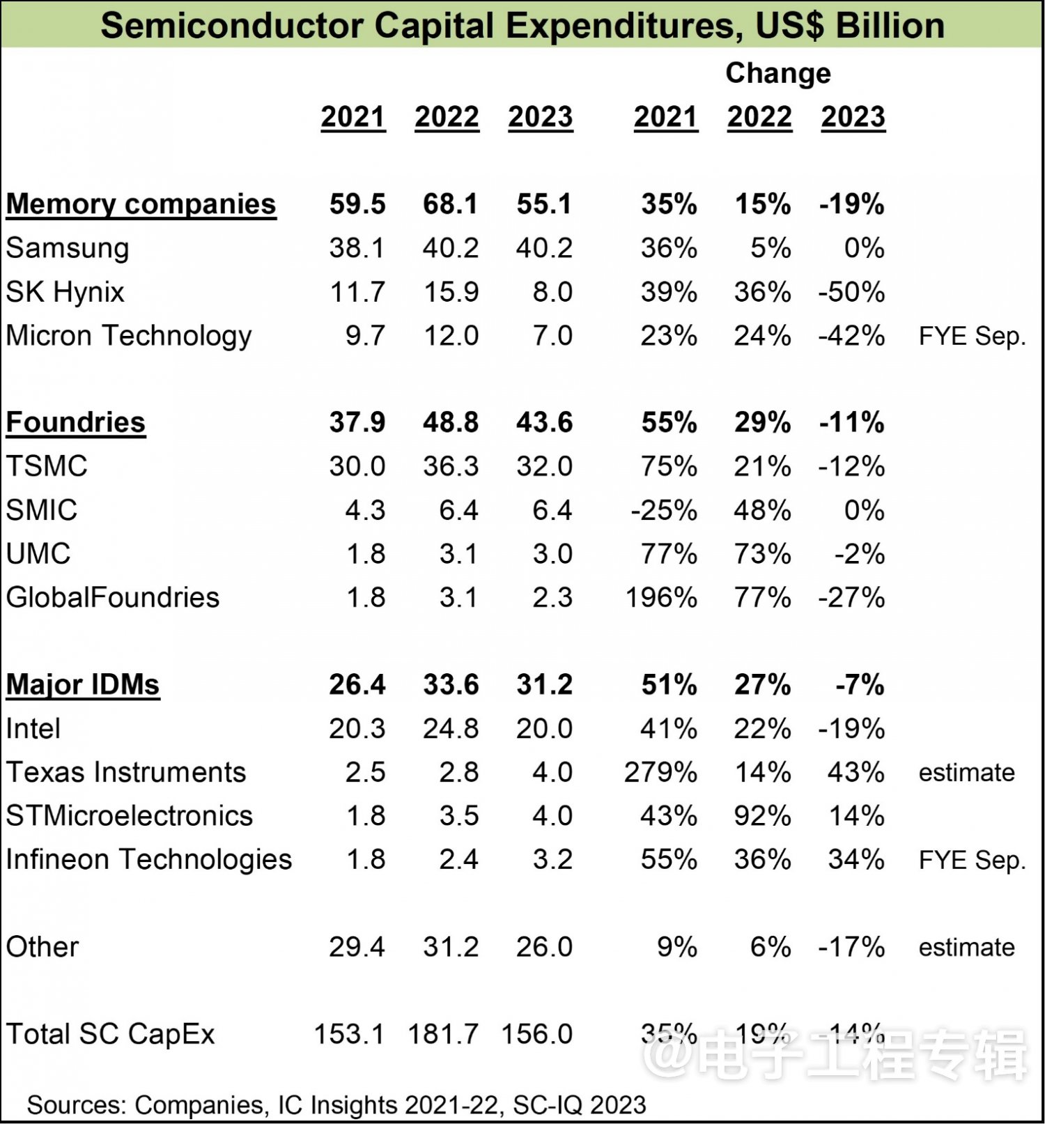 近些年PC和智能手機市場持續低迷,未見起色,存儲產業受創嚴重。除存儲公司的大幅削減支出外,代工廠也將在2023年削減資本支出11%,臺積電削減12%的資本支出,聯電削減2%,格芯削減27%。IDM廠商的資本支出削減為7%,其中英特爾計劃削減19%,德州儀器、意法半導體和英飛凌則迎難而上,在2023年增加資本支出,汽車和工業相關市場做出了主要貢獻。
