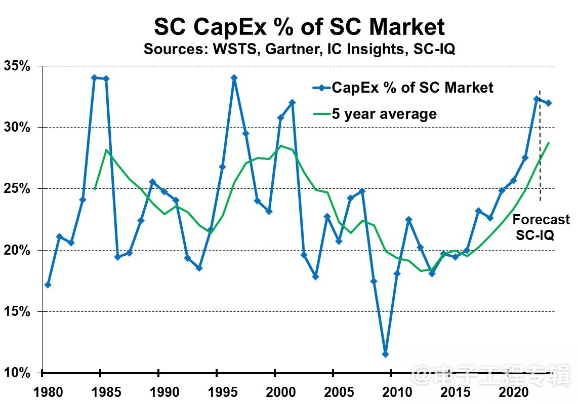 從1980年至今,半導體資本支出占半導體市場的百分比平均為23%,該百分比在年度基礎上從12%到34%不等,在五年平均基礎上的數值是從18%到29%不等。