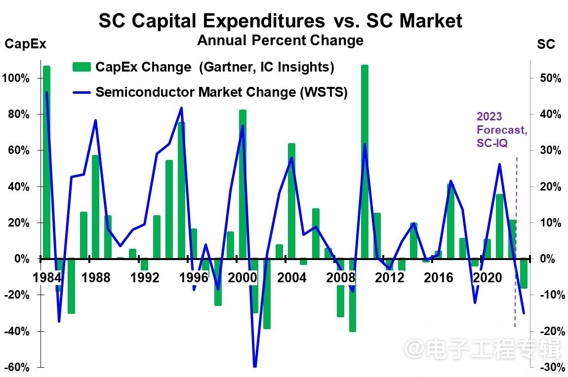 圖5:半導體資本支出與半導體市場關系圖。左側刻度上的綠色條:1984-2023年預測的資本支出的年度變化;右側刻度上的藍色線:半導體市場的年度變化。