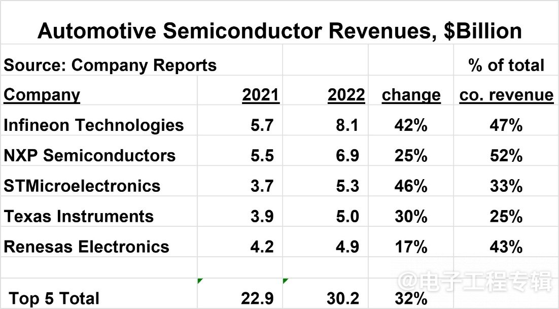 英飛凌、恩智浦、意法半導體、德州儀器、瑞薩是依次排名前TOP5的汽車半導體供應商, 2022年英飛凌汽車半導體以81億美元的營收排名第一,汽車業務占該公司總收入的47%;瑞薩電子的汽車業務營收占比從17%提升至43%,恩智浦的汽車業務占總收入的52%。