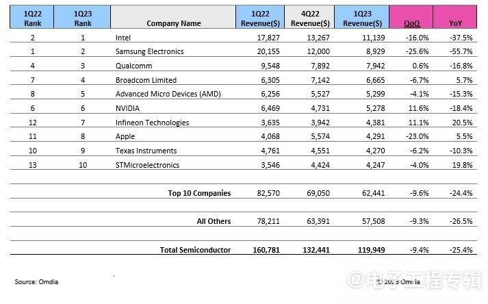 Omdia的最新研究表明,在2023Q1的半導體營收中,三星被英特爾取代,在半導體銷售排行榜上退居第二。在該季度,三星同比下跌55.7%,營收為89.29億美元;英特爾的營收為111.49億美元,同比下跌37.5%。