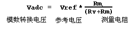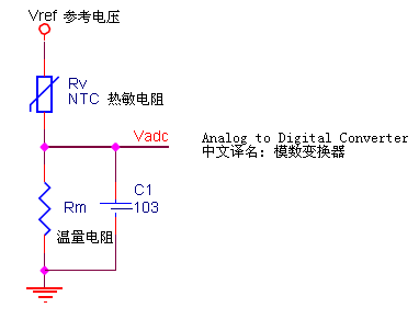 如上圖所示 NTC 熱敏電阻 Rv 和測量電阻 Rm(精密電阻)組成一個簡單的串聯分壓電路,參考電壓VCC_Ref 經過分壓可以得到一個電壓值隨著溫度值變化而變化的數值,這個電壓的大小將反映出NTC 電阻的大小,從而也就是相應溫度值的反映。 通過歐姆定律可以得到輸出電壓值 Vadc 和 NTC 電阻值的一個關系