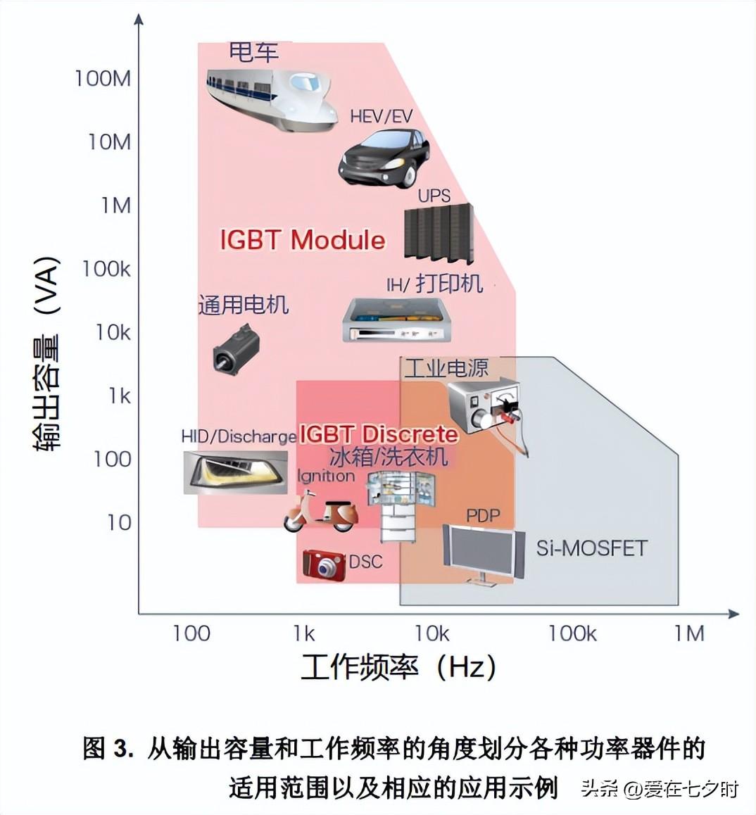 從 IGBT 和其他功率器件的輸出容量和工作頻率的角度介紹了它們各自的適用范圍。本章將介紹 IGBT的適用范圍和應用產品之間的關系。