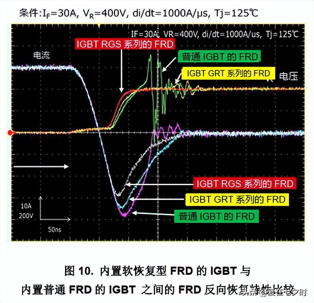 作為示例,在下圖 10 中對內置軟恢復型 FRD 的 RGS 系列和 RGT 系列 IGBT 與內置普通 FRD 的 IGBT 之間的 FRD反向恢復特性進行了比較。