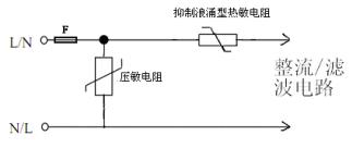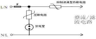 使用較少的器件,4個壓敏電阻和保險絲的組合,壓敏電阻使用20D102K;保險(xian)絲使用(yong)(yong)10A慢斷的保險(xian)絲,保險(xian)絲的主(zhu)要作用(yong)(yong)是在壓敏電阻(zu)老化短路失效(xiao)后,使其和主(zhu)電路脫離,防止火災。