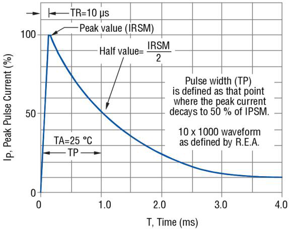 TVS二極管的(de)(de)功率等級是在特定的(de)(de)測(ce)試(shi)或應(ying)用條(tiao)件(jian)(jian)下的(de)(de)浪涌吸(xi)收能力。YINT的(de)(de)TVS二極(ji)管產品使用業(ye)內標準(zhun)的(de)(de)10/1000 μs脈(mo)沖波(bo)形(Bellcore 1089標準(zhun))做為測(ce)試(shi)條(tiao)件(jian)(jian),如(ru)圖(tu)(tu)1所示(shi)。這(zhe)個測(ce)試(shi)條(tiao)件(jian)(jian)不同于浪涌測(ce)試(shi)的(de)(de)8/20 μs脈(mo)沖波(bo)形,如(ru)圖(tu)(tu)2所示(shi)。