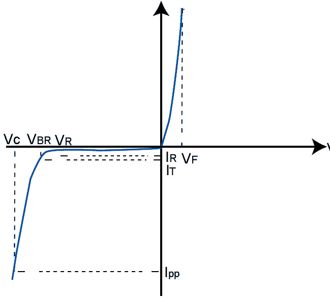 在指定的峰值脈沖電流等級下,出現在TVS上的箝位電壓等級。TVS的擊穿電壓是在非常低的電流下測得的,如1mA或10mA, 與應用條件中實際的雪崩電壓是不同的。因此,半導體制造商會指明在大電流條件下的典型或最大擊穿電壓。
