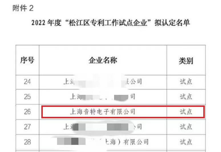 近日,經過專家評審、網上公示和復核等程序,正式認定上海音特電子有限公司為上海市松江區專利試點企業。