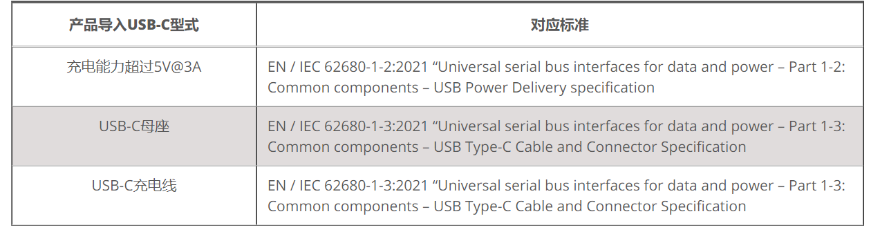 上述13類產品只要能夠通過線纜進行充電,都被要求強制配備符合EN IEC 62680-1-3:2021標準的USB Type-C ®充電接口并能夠使用符合相同標準的充電線纜進行充電,其中支持快充的設備應符合EN IEC 62680-1-2:2021標準的USB PD(Power Delivery)協議。