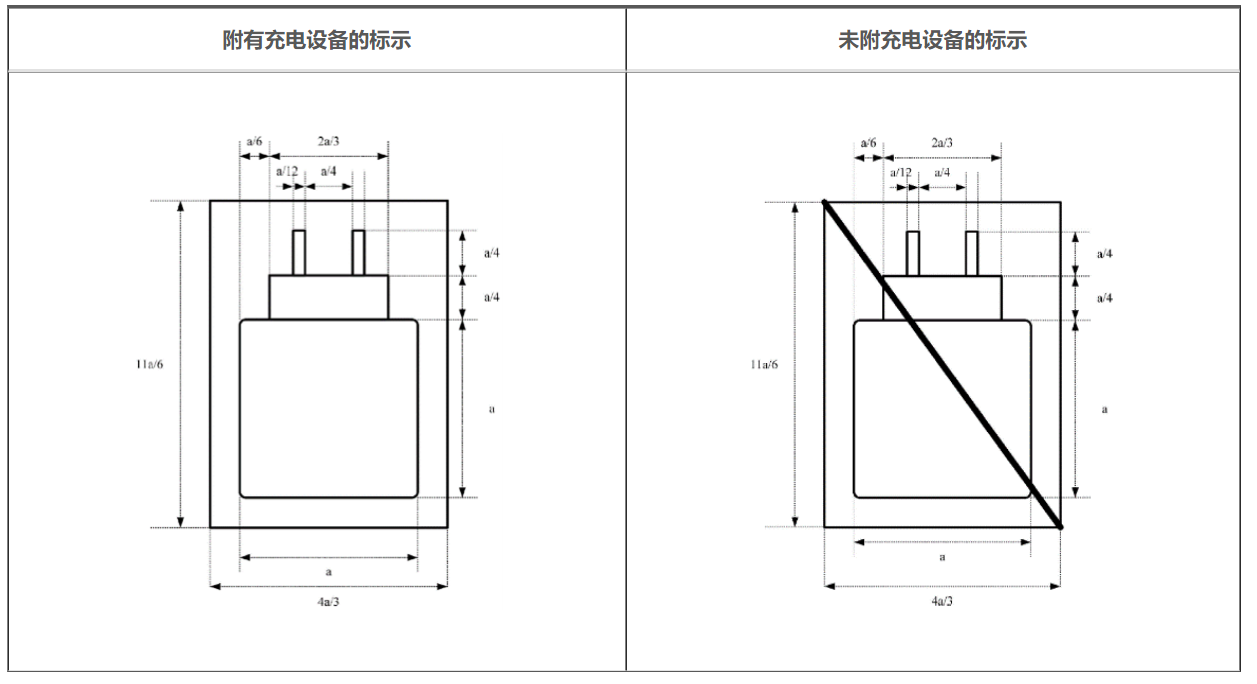 為了確保消費者和其他最終用戶在購買產品時收到有關充電特性的必要信息,指令中產品要求必須標示是否附有充電設備(表2),以及(若附有充電設備)其充電能力(圖1)。