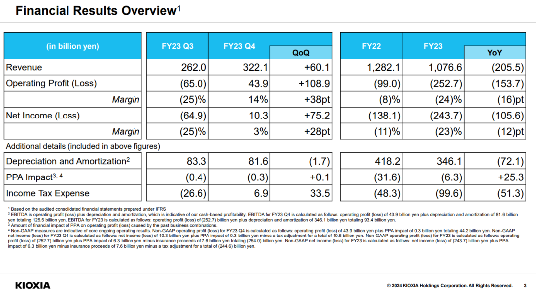 該季鎧俠營收3221億日元,環比增長60.1%,實現營業利潤439億日元、凈利潤103億日元,二者環比皆扭虧為盈。