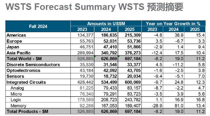 根據世界半導體貿易統計組織(WSTS)的數據,2024 年全球半導體銷售額達 6276 億美元,同比增長 19.1%,該機構預計,2025 年全球半導體市場的增幅將回落到 11.2%,全球市場估值將達到約 6970 億美元