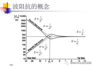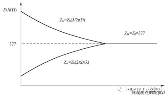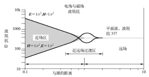波阻抗還與觀測點到輻射源的距離有關,當距離大于波長的1/6時,無論輻射源阻抗是多少,波阻抗都是377歐;我們稱與輻射源之間的距離小于1/6波長的范圍為近場區,大于1/6波長的更遠處為遠場區。