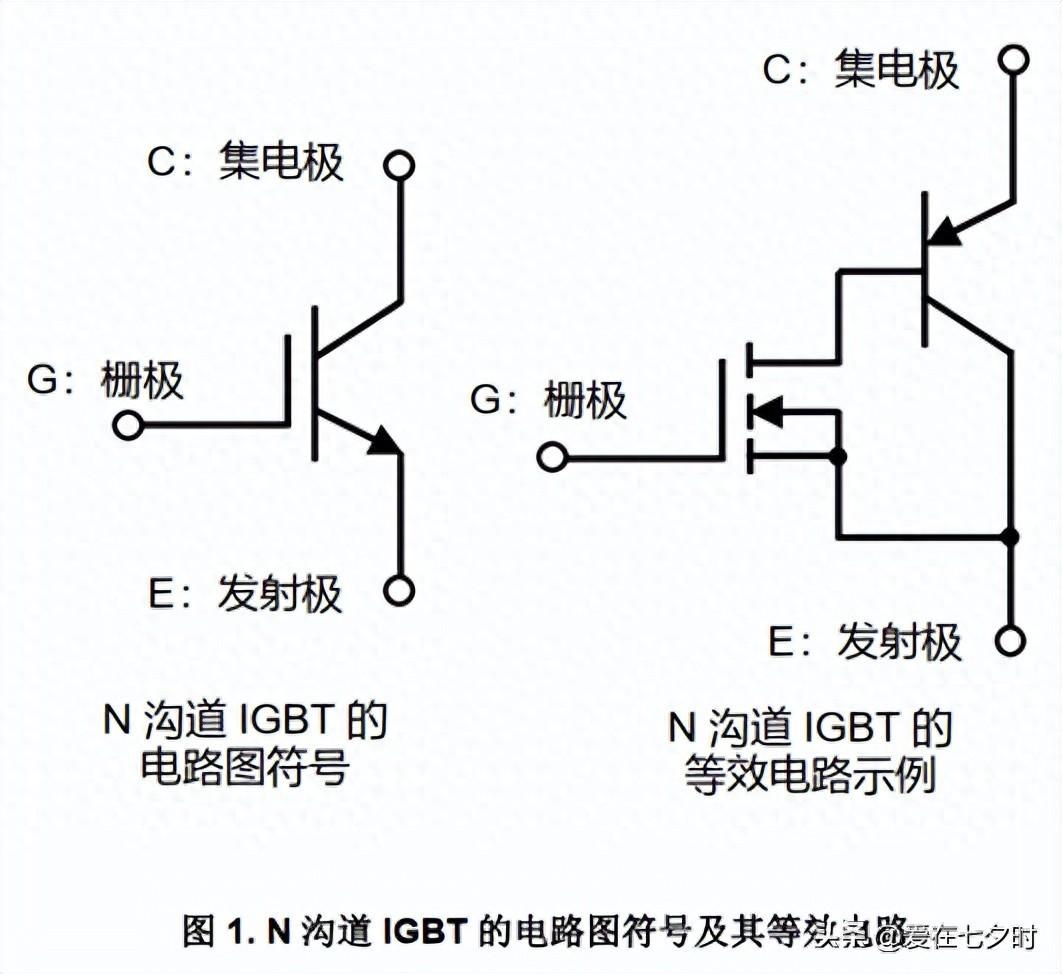 下圖 1 是 N 溝道 IGBT 的電路圖符號及其等效電路。有些等效電路圖會更詳細一些,但這里為了便于理解,給出的是相對簡單的示意圖。包括結構在內,實際的產品會更復雜一些。有關結構等的詳細內容后續會進行介紹。