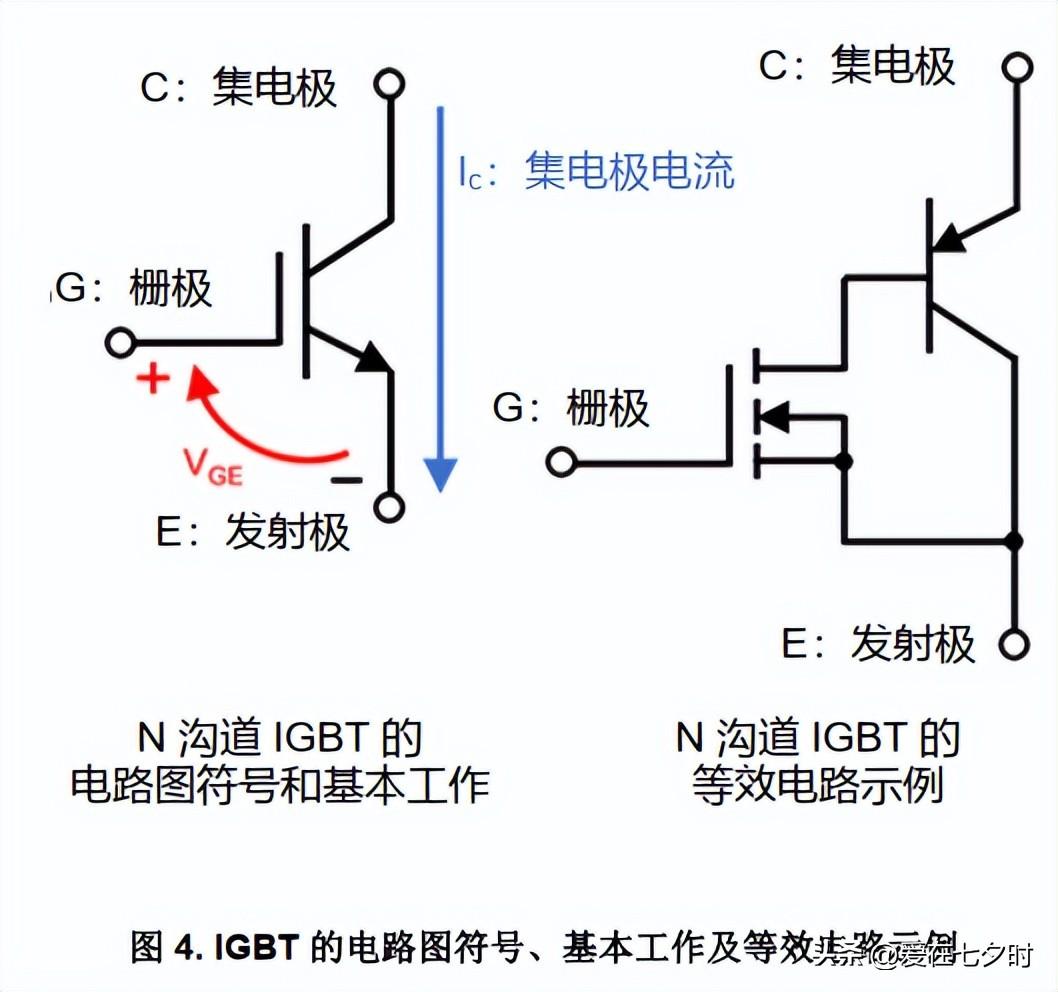 為了便于理解 IGBT 半導體的結構,下圖4 帶我們回顧一下電路圖符號、簡單的等效電路以及 IGBT 的基本工作。