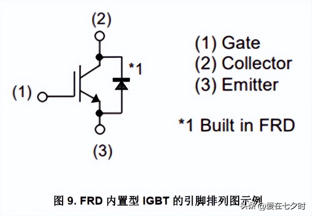 內置 FRD 的 IGBT,會在其技術規格書中標明內置 FRD,通常,其引腳排列圖中會如下圖 9 所示標明內置有 FRD。另外,除了 IGBT 的規格之外,技術規格書中還會提供內置FRD 的規格。
