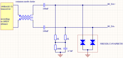 符合開放技術聯盟 100/1000 BASE-T1 標準,采用小型 SOT23 表面貼裝塑料封裝,旨在保護兩條車載網絡總線線路免受 ESD 和其他瞬態事件的損壞